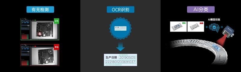 • 【丰富的视觉检测工具】内置丰富的视觉检测工具以及强大的边缘AI加持,可进行灵活组合和调整,以满足各种场景需求。可实现有无判断、计数、正反检测、二分类、OCR识别等。